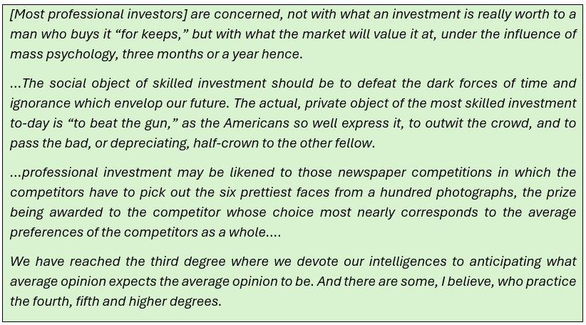 Keynes wrote about this in 1936 in his book “The General Theory of Employment, Interest and Money” but it is as relevant today as it was then.